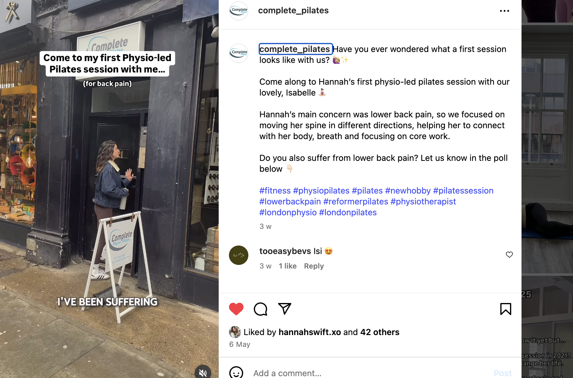 In the example below, Complete Pilates shares user-generated content (UGC) on their social channels to give potential clients a clear, authentic view of what to expect when attending a session at one of their clinics. This not only builds trust and transparency but also creates a sense of community and social proof - showing that others are already engaging and benefiting, which encourages new clients to take the first step.