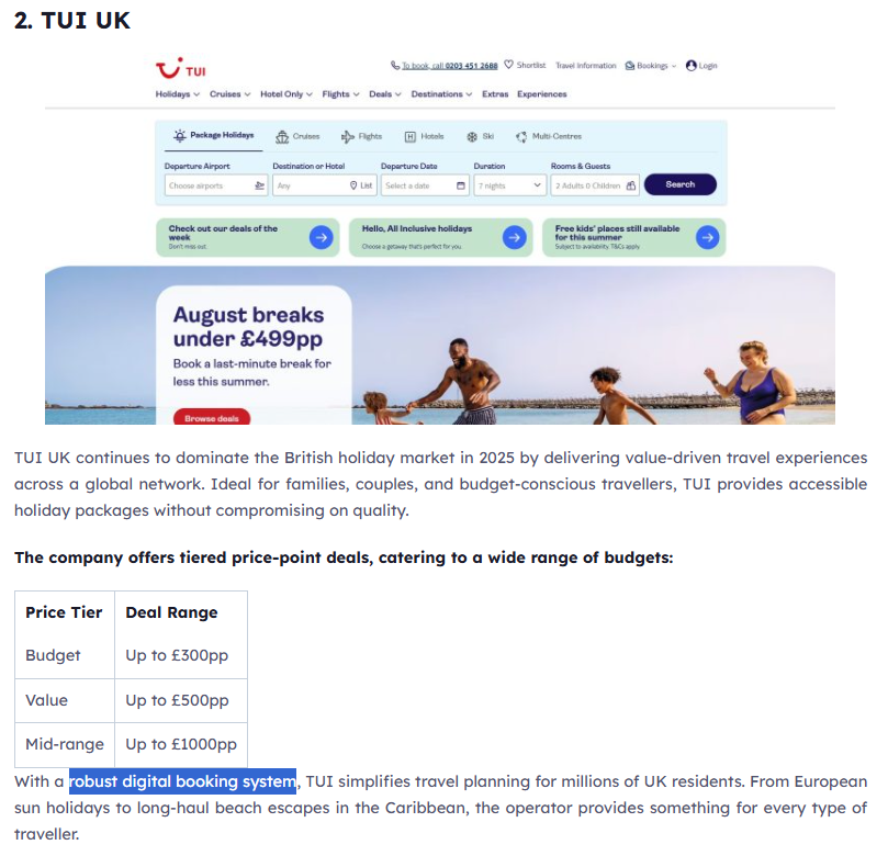 In this case, if we were working for TUI with their AI optimisation, we could reach out to this article and suggest some alternative wording to try and shift the LLM’s focus towards something more favourable.