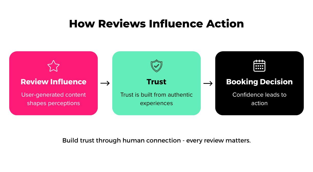 Positive reviews also tie to confirmation bias; when travellers see feedback that aligns with their expectations, they feel reassured and are more likely to book.