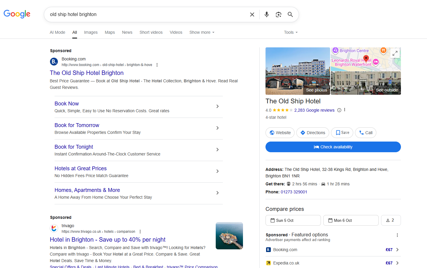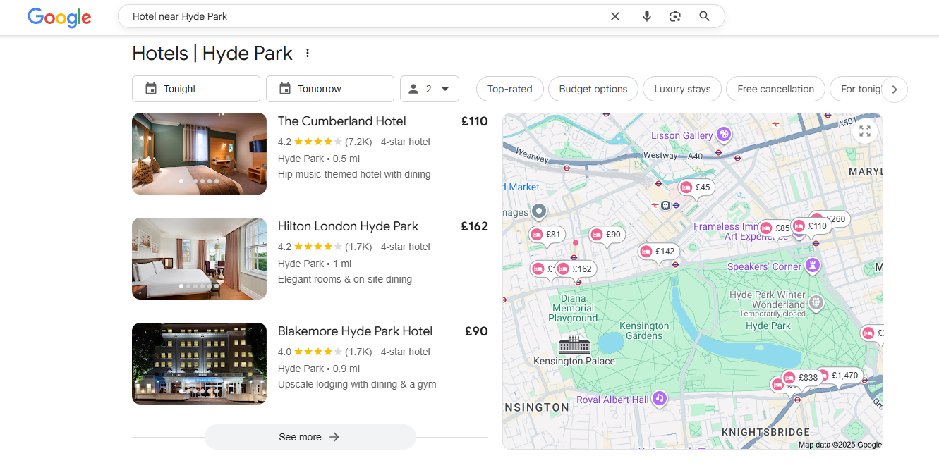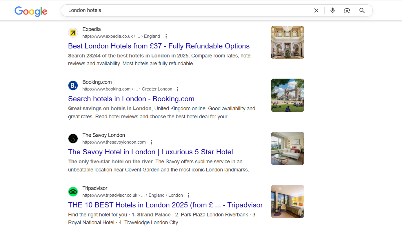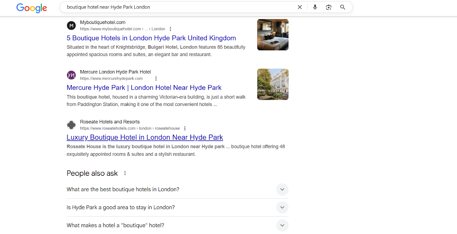 Travellers often start their booking journey with a destination-first mindset. Instead of searching directly for your hotel brand, they’re more likely to type queries such as: