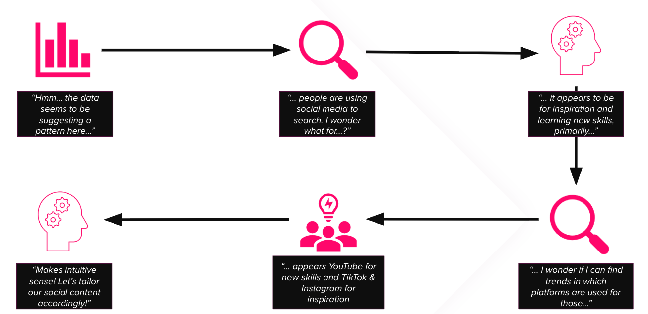 Effectively, what we’ve done is move through the process of observing something in data, attempting to explain it (hopefully with a human-first behavioural lens) and weaponise it to drive the desired business performance.