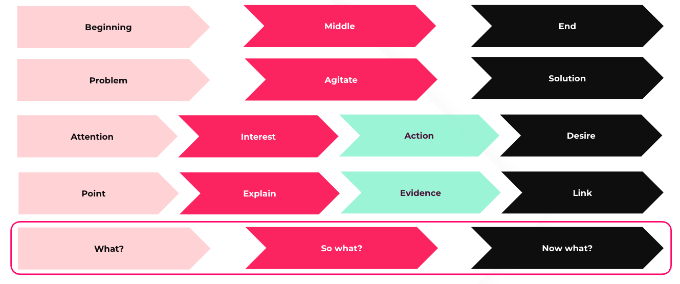 I’ve cheated a little here. Some of these are copywriting tricks that we use to write really compelling messaging, but they’re still storytelling structures, as they organise our message into a sequential order, with each preceding element setting up the next.