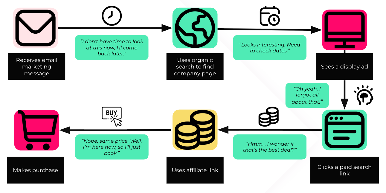 Here’s an example from a Path to Conversion project for a travel company. First, just read the text in the pink boxes, which was a real journey through the various touchpoints that resulted in a sale.